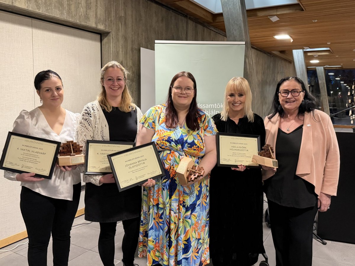 Múrbrjótar 2025. Frá vinstri Sara Rós Kristinsdóttir, Lóa Fastestveit Ólafsdóttir, Jóhanna Brynja Ólafsdóttir, Ágústa Björnsdóttir sem veitti viðurkenningunni viðtöku f.h. Heklu Björk Hólmarsdóttur, Inga Sæland félags- og húsnæðismálaráðherra.